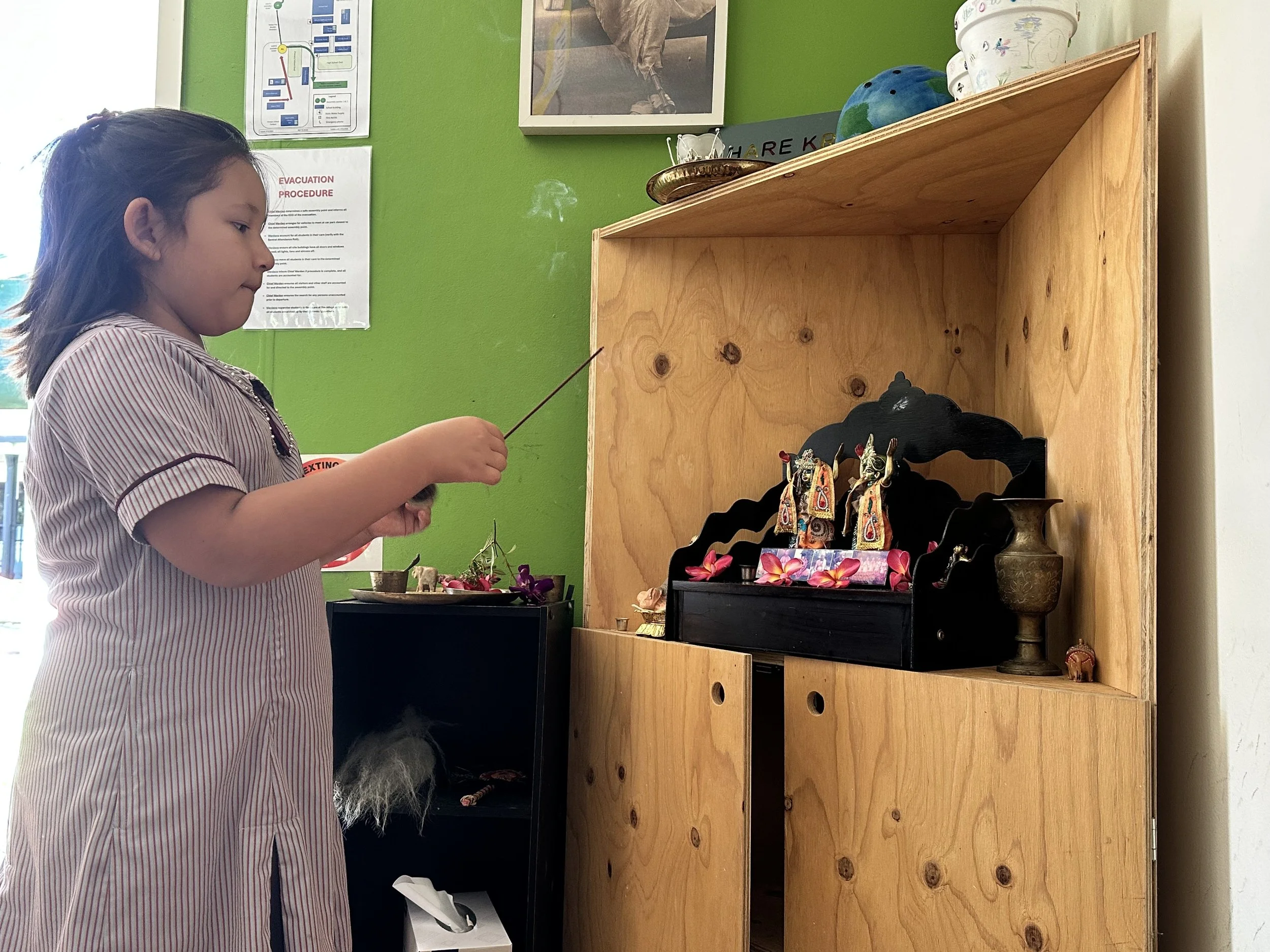 Each morning, students offer a simple kirtan and arati to their class deities. These daily rituals provide a nurturing environment for children to naturally develop their devotional inclinations and build a personal relationship with Krishna.